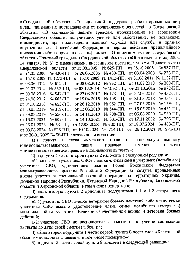 Постановление Правительства Свердловской области от 13.03.2025 N 176-ПП "О внесении изменений в Порядок и условия предоставления социальной выплаты на приобретение земельного участка военнослужащим, лицам, заключившим контракт о пребывании в добровольческом формировании, содействующем выполнению задач, возложенных на Вооруженные Силы Российской Федерации (войска национальной гвардии Российской Федерации), и лицам, проходящим (проходившим) службу в войсках национальной гвардии Российской Федерации и имеющим специальные звания полиции, удостоенным звания Героя Российской Федерации или награжденным орденами Российской Федерации за заслуги, проявленные в ходе участия в специальной военной операции на территориях Украины, Донецкой Народной Республики, Луганской Народной Республики, Запорожской области и Херсонской области, и являющимся ветеранами боевых действий, а также членам семей указанных лиц в случае их гибели (смерти), утвержденные постановлением Правительства Свердловской области от 28.12.2004 N 1178 ПП"