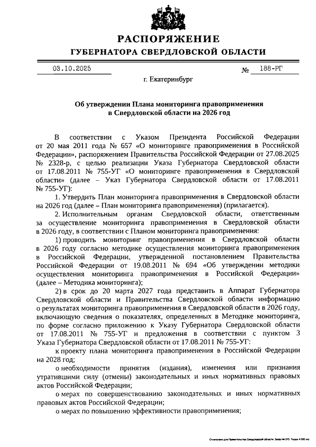 Распоряжение Губернатора Свердловской области от 03.10.2025 N 188-РГ "Об утверждении Плана мониторинга правоприменения в Свердловской области на 2026 год"