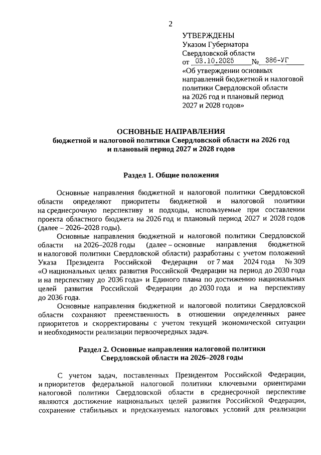 Указ Губернатора Свердловской области от 03.10.2025 N 386-УГ "Об утверждении основных направлений бюджетной и налоговой политики Свердловской области на 2026 год и плановый период 2027 и 2028 годов"