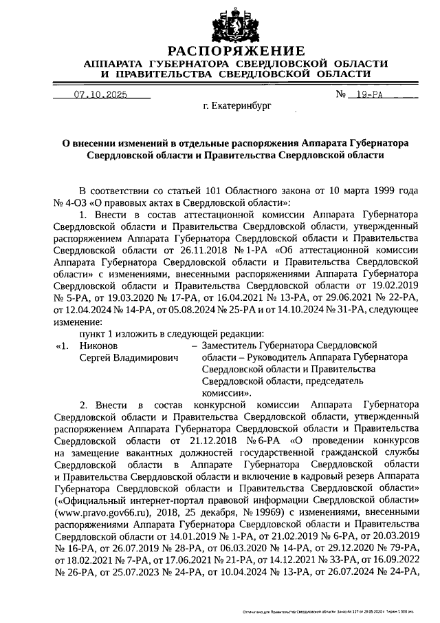 Распоряжение Аппарата Губернатора Свердловской области и Правительства Свердловской области от 07.10.2025 N 19-РА "О внесении изменений в отдельные распоряжения Аппарата Губернатора Свердловской области и Правительства Свердловской области"