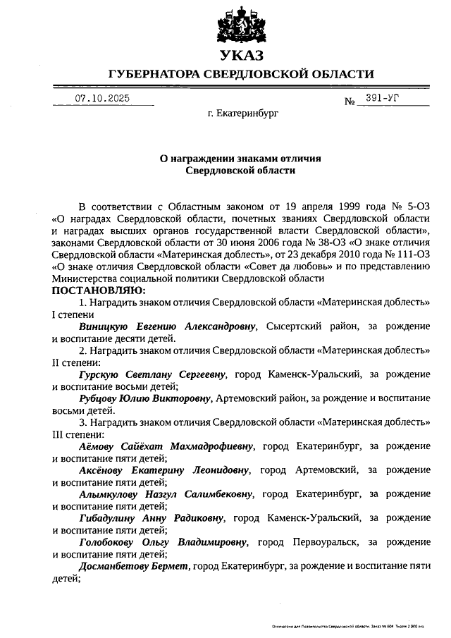 Указ Губернатора Свердловской области от 07.10.2025 N 391-УГ "О награждении знаками отличия Свердловской области"