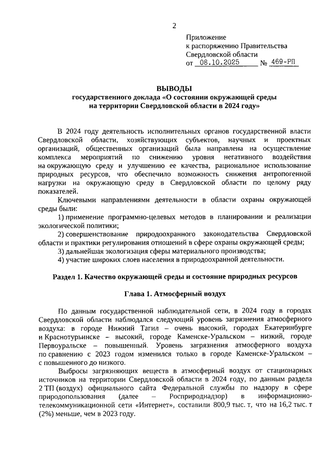 Распоряжение Правительства Свердловской области от 08.10.2025 N 469-РП "О государственном докладе "О состоянии окружающей среды на территории Свердловской области в 2024 году"