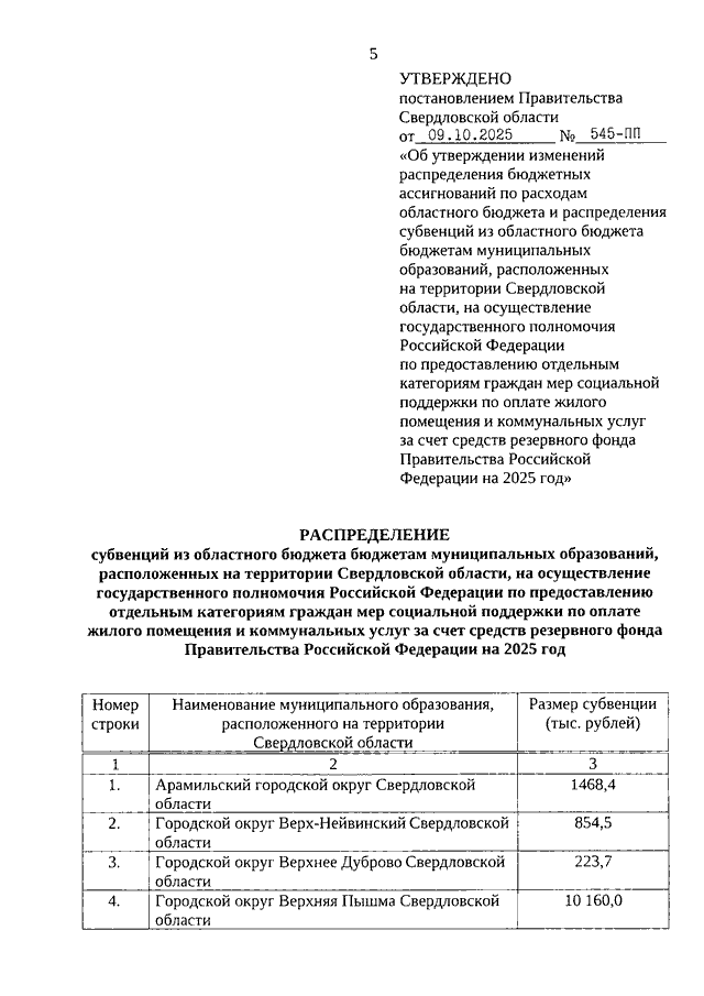 Постановление Правительства Свердловской области от 09.10.2025 N 545-ПП "Об утверждении изменений распределения бюджетных ассигнований по расходам областного бюджета и распределения субвенций из областного бюджета бюджетам муниципальных образований, расположенных на территории Свердловской области, на осуществление государственного полномочия Российской Федерации по предоставлению отдельным категориям граждан мер социальной поддержки по оплате жилого помещения и коммунальных услуг за счет средств резервного фонда Правительства Российской Федерации на 2025 год"