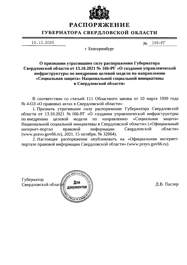Распоряжение Губернатора Свердловской области от 10.10.2025 N 196-РГ "О признании утратившим силу Распоряжения Губернатора Свердловской области от 13.10.2021 N 166-РГ "О создании управленческой инфраструктуры по внедрению целевой модели по направлению "Социальная защита" Национальной социальной инициативы в Свердловской области"