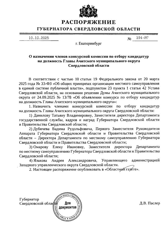 Распоряжение Губернатора Свердловской области от 10.10.2025 N 194-РГ "О назначении членов конкурсной комиссии по отбору кандидатур на должность Главы Ачитского муниципального округа Свердловской области"