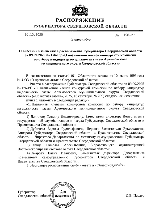 Распоряжение Губернатора Свердловской области от 10.10.2025 N 195-РГ "О внесении изменения в распоряжение Губернатора Свердловской области от 09.09.2025 N 176-РГ "О назначении членов конкурсной комиссии по отбору кандидатур на должность главы Артемовского муниципального округа Свердловской области"