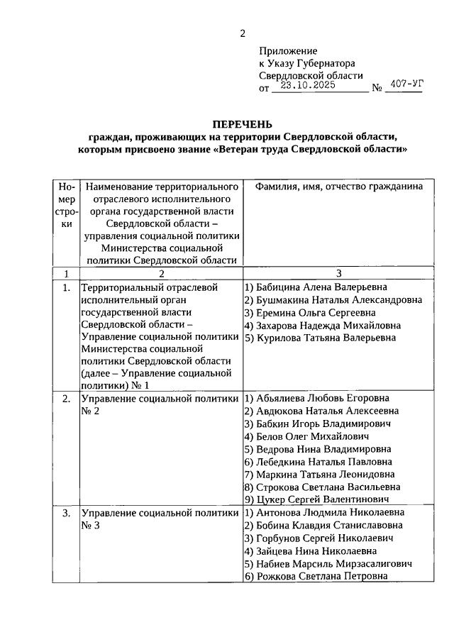 Указ Губернатора Свердловской области от 23.10.2025 N 407-УГ "О присвоении звания "Ветеран труда Свердловской области"