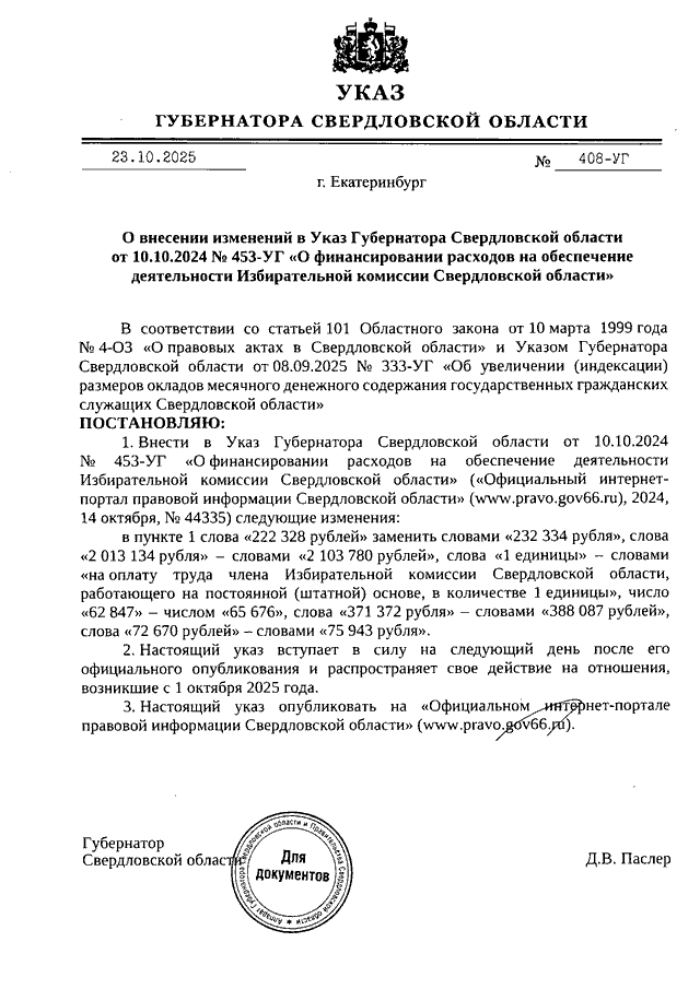 Указ Губернатора Свердловской области от 23.10.2025 N 408-УГ "О внесении изменений в Указ Губернатора Свердловской области от 10.10.2024 N 453-УГ "О финансировании расходов на обеспечение деятельности Избирательной комиссии Свердловской области"
