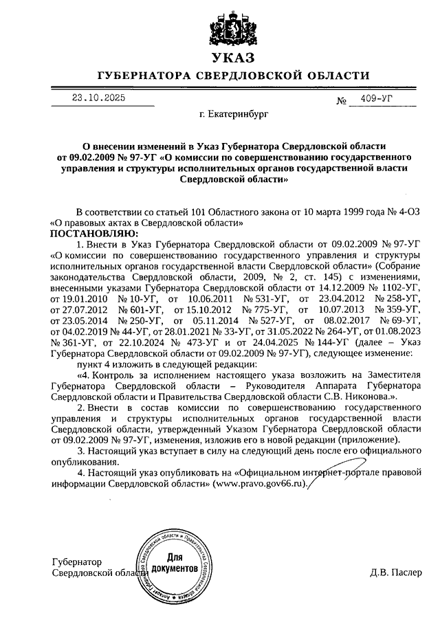 Указ Губернатора Свердловской области от 23.10.2025 N 409-УГ "О внесении изменений в Указ Губернатора Свердловской области от 09.02.2009 N 97-УГ "О комиссии по совершенствованию государственного управления и структуры исполнительных органов государственной власти Свердловской области"