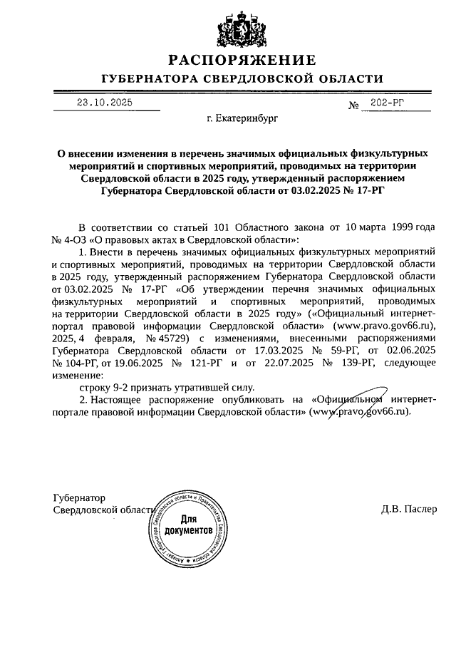 Распоряжение Губернатора Свердловской области от 23.10.2025 N 202-РГ "О внесении изменения в перечень значимых официальных физкультурных мероприятий и спортивных мероприятий, проводимых на территории Свердловской области в 2025 году, утвержденный Распоряжением Губернатора Свердловской области от 03.02.2025 N 17-РГ"