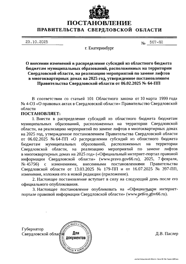 Постановление Правительства Свердловской области от 23.10.2025 N 567-ПП "О внесении изменений в распределение субсидий из областного бюджета бюджетам муниципальных образований, расположенных на территории Свердловской области, на реализацию мероприятий по замене лифтов в многоквартирных домах на 2025 год, утвержденное Постановлением Правительства Свердловской области от 06.02.2025 N 64-ПП"
