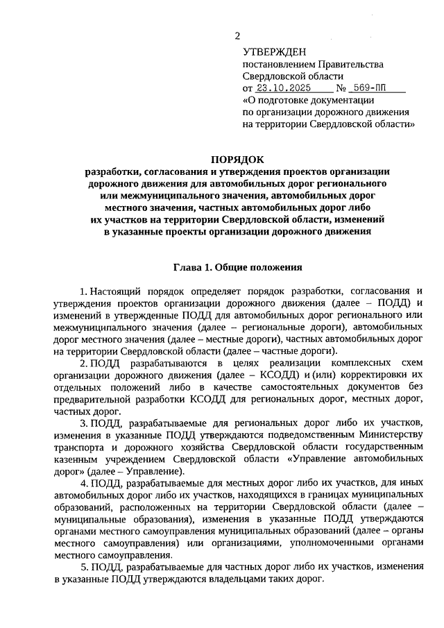 Постановление Правительства Свердловской области от 23.10.2025 N 569-ПП "О подготовке документации по организации дорожного движения на территории Свердловской области" (вместе с "Порядком разработки, согласования и утверждения проектов организации дорожного движения для автомобильных дорог регионального или межмуниципального значения, автомобильных дорог местного значения, частных автомобильных дорог либо их участков на территории Свердловской области, изменений в указанные проекты организации дорожного движения", "Порядком разработки, согласования и утверждения комплексных схем организации дорожного движения для муниципальных образований, расположенных на территории Свердловской области, либо их частей, а также для нескольких муниципальных образований, расположенных на территории Свердловской области, имеющих общую границу, изменений в утвержденные комплексные схемы организации дорожного движения")