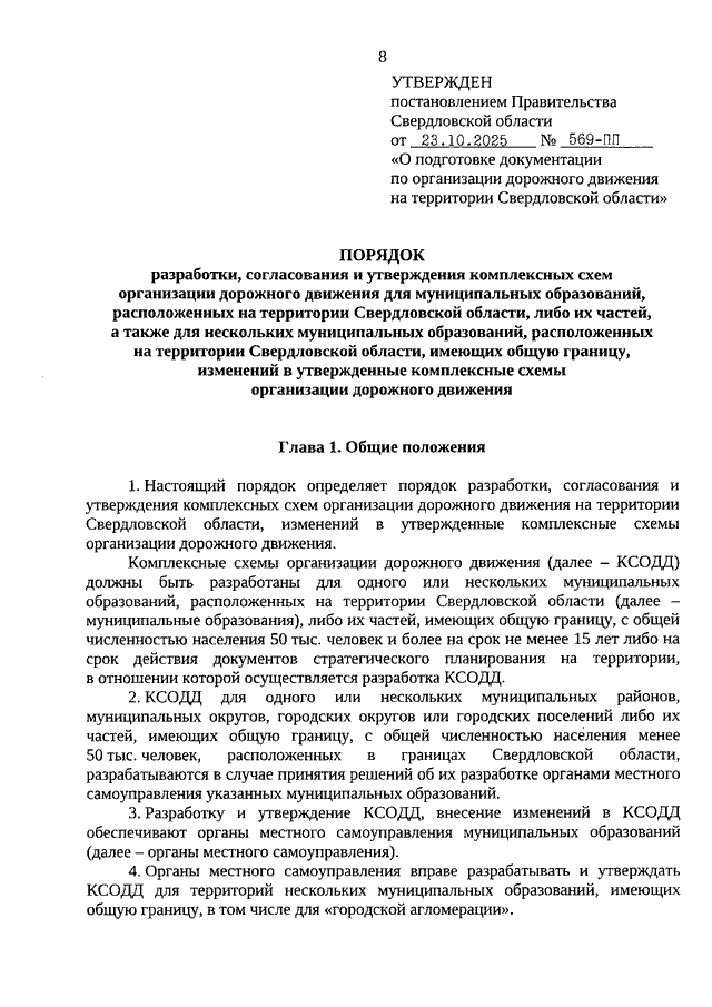 Постановление Правительства Свердловской области от 23.10.2025 N 569-ПП "О подготовке документации по организации дорожного движения на территории Свердловской области" (вместе с "Порядком разработки, согласования и утверждения проектов организации дорожного движения для автомобильных дорог регионального или межмуниципального значения, автомобильных дорог местного значения, частных автомобильных дорог либо их участков на территории Свердловской области, изменений в указанные проекты организации дорожного движения", "Порядком разработки, согласования и утверждения комплексных схем организации дорожного движения для муниципальных образований, расположенных на территории Свердловской области, либо их частей, а также для нескольких муниципальных образований, расположенных на территории Свердловской области, имеющих общую границу, изменений в утвержденные комплексные схемы организации дорожного движения")