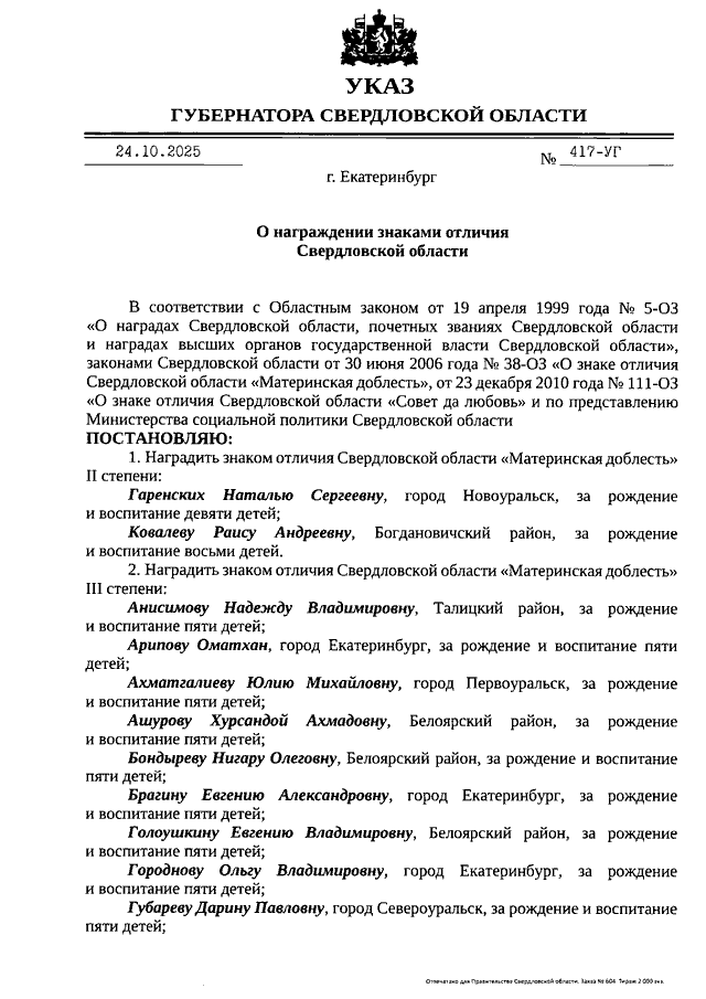 Указ Губернатора Свердловской области от 24.10.2025 N 417-УГ "Награждение"