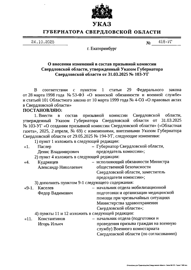 Указ Губернатора Свердловской области от 24.10.2025 N 418-УГ "О внесении изменений в состав призывной комиссии Свердловской области, утвержденный Указом Губернатора Свердловской области от 31.03.2025 N 103-УГ"