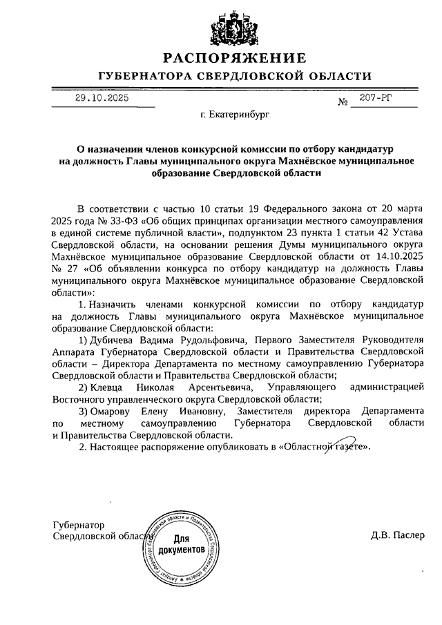 Распоряжение Губернатора Свердловской области от 29.10.2025 N 207-РГ "О назначении членов конкурсной комиссии по отбору кандидатур на должность Главы муниципального округа Махневское муниципальное образование Свердловской области"