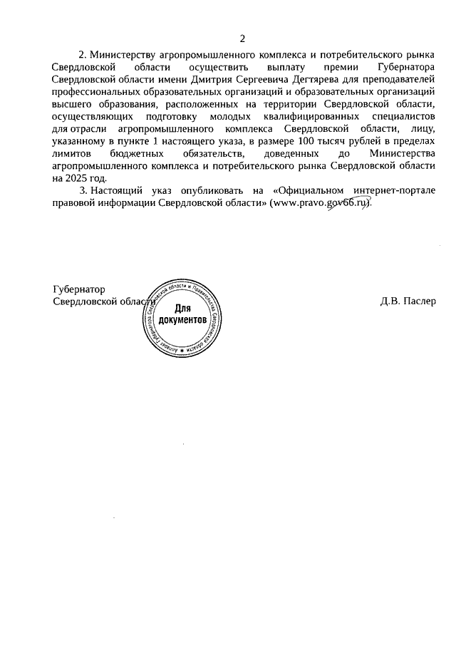 Указ Губернатора Свердловской области от 29.10.2025 N 431-УГ "О присуждении премии Губернатора Свердловской области имени Дмитрия Сергеевича Дегтярева для преподавателей профессиональных образовательных организаций и образовательных организаций высшего образования, расположенных на территории Свердловской области, осуществляющих подготовку молодых квалифицированных специалистов для отрасли агропромышленного комплекса Свердловской области"