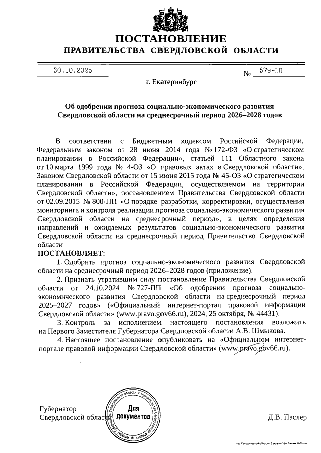 Постановление Правительства Свердловской области от 30.10.2025 N 579-ПП "Об одобрении прогноза социально-экономического развития Свердловской области на среднесрочный период 2026 - 2028 годов"