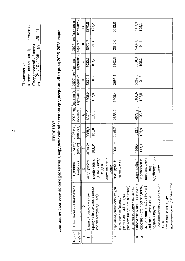 Постановление Правительства Свердловской области от 30.10.2025 N 579-ПП "Об одобрении прогноза социально-экономического развития Свердловской области на среднесрочный период 2026 - 2028 годов"