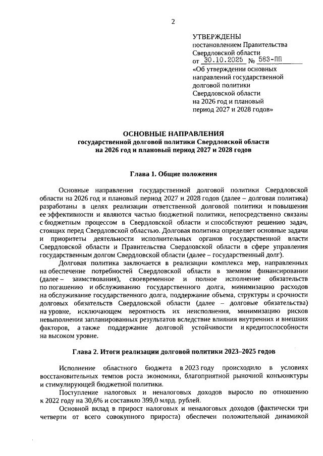 Постановление Правительства Свердловской области от 30.10.2025 N 583-ПП "Об утверждении основных направлений государственной долговой политики Свердловской области на 2026 год и плановый период 2027 и 2028 годов"
