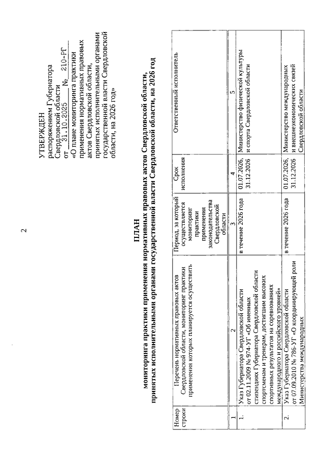 Распоряжение Губернатора Свердловской области от 31.10.2025 N 210-РГ О плане мониторинга практики применения нормативных правовых актов Свердловской области, принятых исполнительными органами государственной власти Свердловской области, на 2026 год