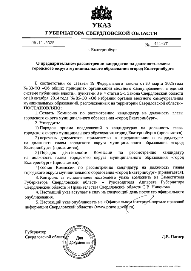 Указ Губернатора Свердловской области от 05.11.2025 N 441-УГ "О предварительном рассмотрении кандидатов на должность главы городского округа муниципального образования "город Екатеринбург" (вместе с "Порядком приема предложений о кандидатурах на должность главы городского округа муниципального образования "город Екатеринбург", "Перечнем документов, прилагаемых к предложениям о кандидатурах на должность главы городского округа муниципального образования "город Екатеринбург", "Порядком деятельности комиссии по рассмотрению кандидатур на должность главы городского округа муниципального образования "город Екатеринбург")