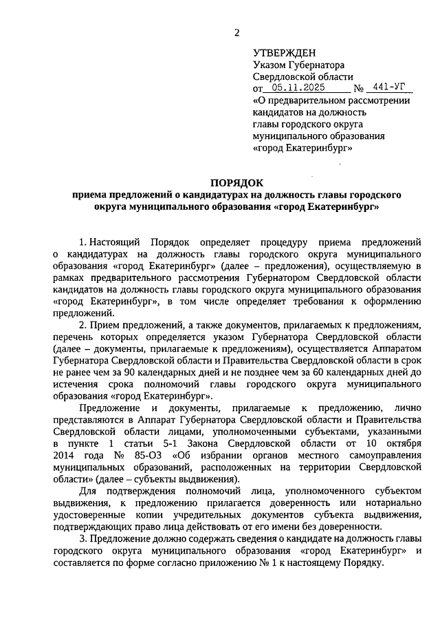 Указ Губернатора Свердловской области от 05.11.2025 N 441-УГ "О предварительном рассмотрении кандидатов на должность главы городского округа муниципального образования "город Екатеринбург" (вместе с "Порядком приема предложений о кандидатурах на должность главы городского округа муниципального образования "город Екатеринбург", "Перечнем документов, прилагаемых к предложениям о кандидатурах на должность главы городского округа муниципального образования "город Екатеринбург", "Порядком деятельности комиссии по рассмотрению кандидатур на должность главы городского округа муниципального образования "город Екатеринбург")