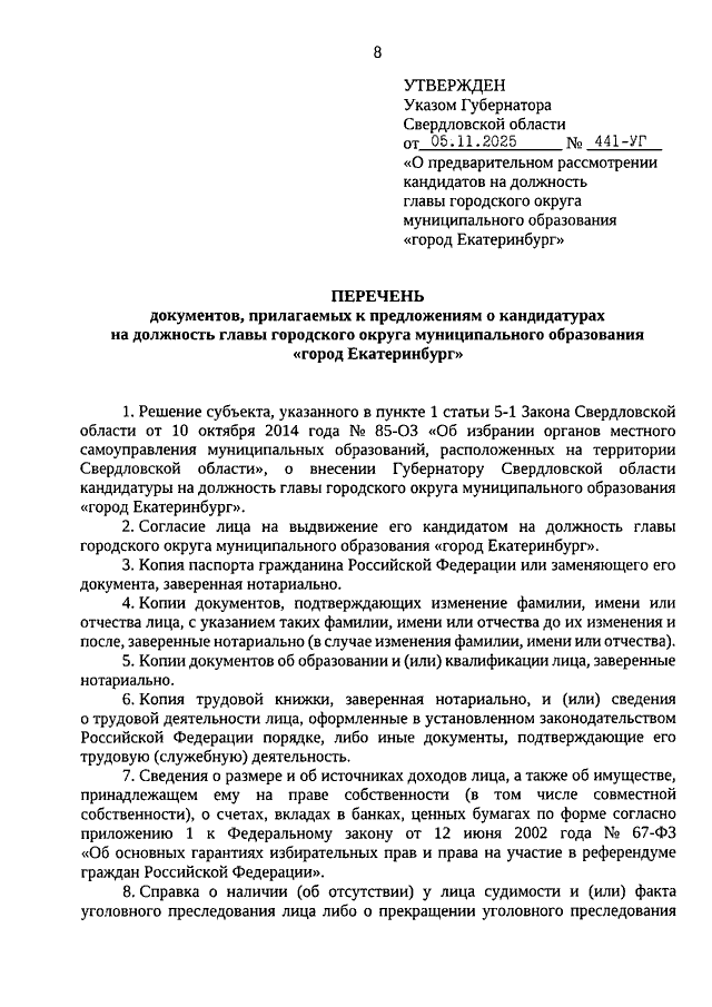 Указ Губернатора Свердловской области от 05.11.2025 N 441-УГ "О предварительном рассмотрении кандидатов на должность главы городского округа муниципального образования "город Екатеринбург" (вместе с "Порядком приема предложений о кандидатурах на должность главы городского округа муниципального образования "город Екатеринбург", "Перечнем документов, прилагаемых к предложениям о кандидатурах на должность главы городского округа муниципального образования "город Екатеринбург", "Порядком деятельности комиссии по рассмотрению кандидатур на должность главы городского округа муниципального образования "город Екатеринбург")