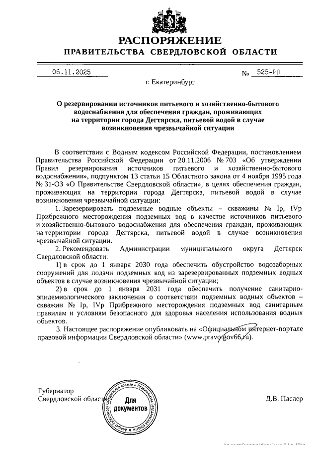 Распоряжение Правительства Свердловской области от 06.11.2025 N 525-РП "О резервировании источников питьевого и хозяйственно-бытового водоснабжения для обеспечения граждан, проживающих на территории города Дегтярска, питьевой водой в случае возникновения чрезвычайной ситуации"