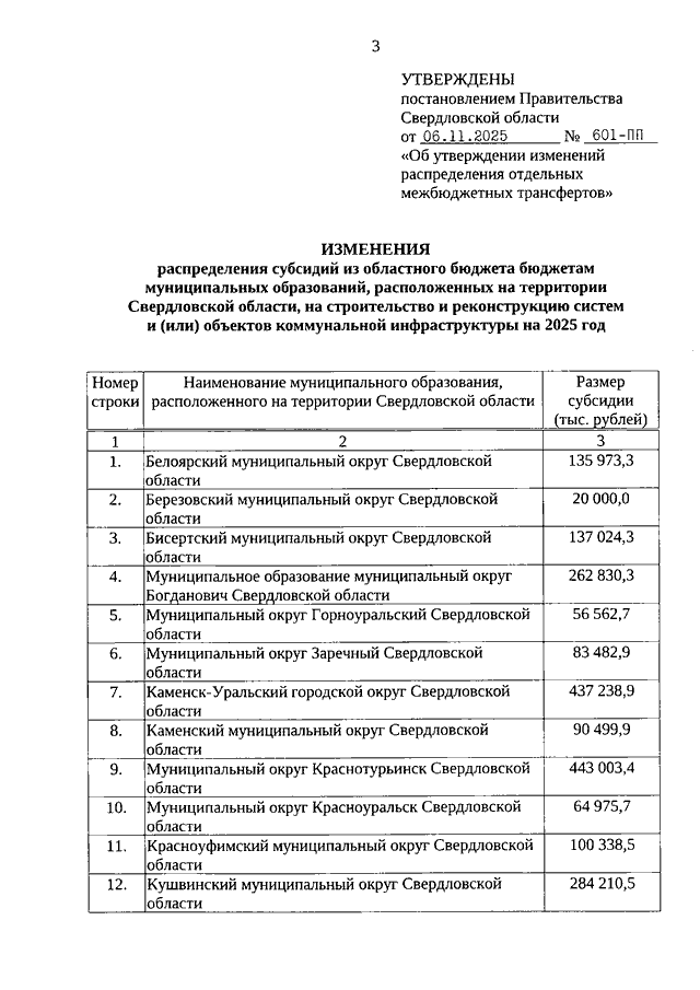 Постановление Правительства Свердловской области от 06.11.2025 N 601-ПП "Об утверждении изменений распределения отдельных межбюджетных трансфертов"