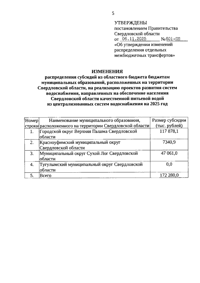 Постановление Правительства Свердловской области от 06.11.2025 N 601-ПП "Об утверждении изменений распределения отдельных межбюджетных трансфертов"