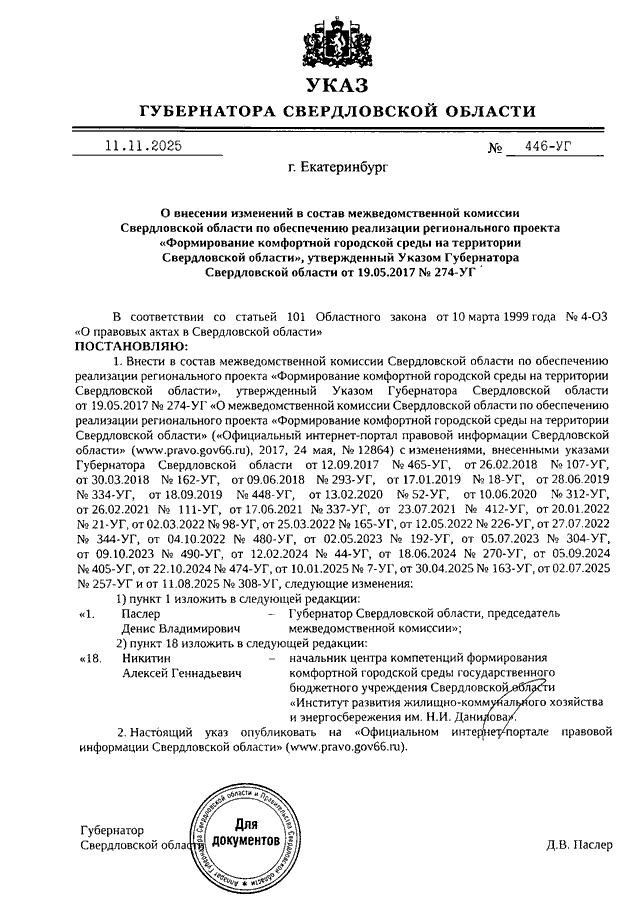 Указ Губернатора Свердловской области от 11.11.2025 N 446-УГ "О внесении изменений в состав межведомственной комиссии Свердловской области по обеспечению реализации регионального проекта "Формирование комфортной городской среды на территории Свердловской области", утвержденный Указом Губернатора Свердловской области от 19.05.2017 N 274-УГ"