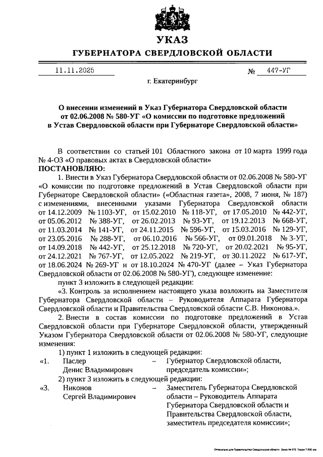 Указ Губернатора Свердловской области от 11.11.2025 N 447-УГ "О внесении изменений в Указ Губернатора Свердловской области от 02.06.2008 N 580-УГ "О комиссии по подготовке предложений в Устав Свердловской области при Губернаторе Свердловской области"