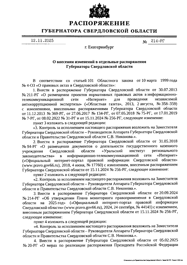 Распоряжение Губернатора Свердловской области от 12.11.2025 N 214-РГ "О внесении изменений в отдельные распоряжения Губернатора Свердловской области"