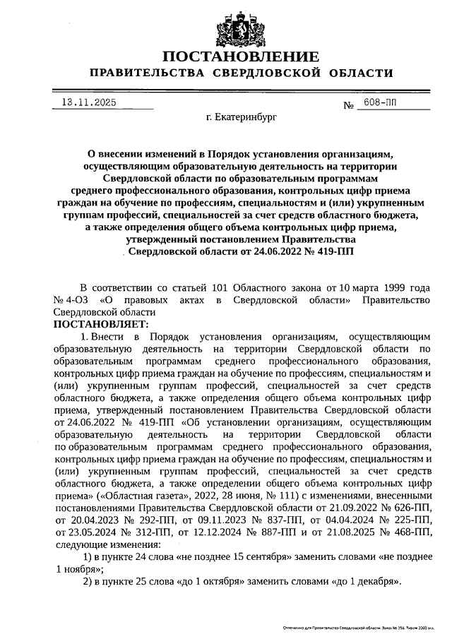 Постановление Правительства Свердловской области от 13.11.2025 N 608-ПП "О внесении изменений в Порядок установления организациям, осуществляющим образовательную деятельность на территории Свердловской области по образовательным программам среднего профессионального образования, контрольных цифр приема граждан на обучение по профессиям, специальностям и (или) укрупненным группам профессий, специальностей за счет средств областного бюджета, а также определения общего объема контрольных цифр приема, утвержденный Постановлением Правительства Свердловской области от 24.06.2022 N 419-ПП"