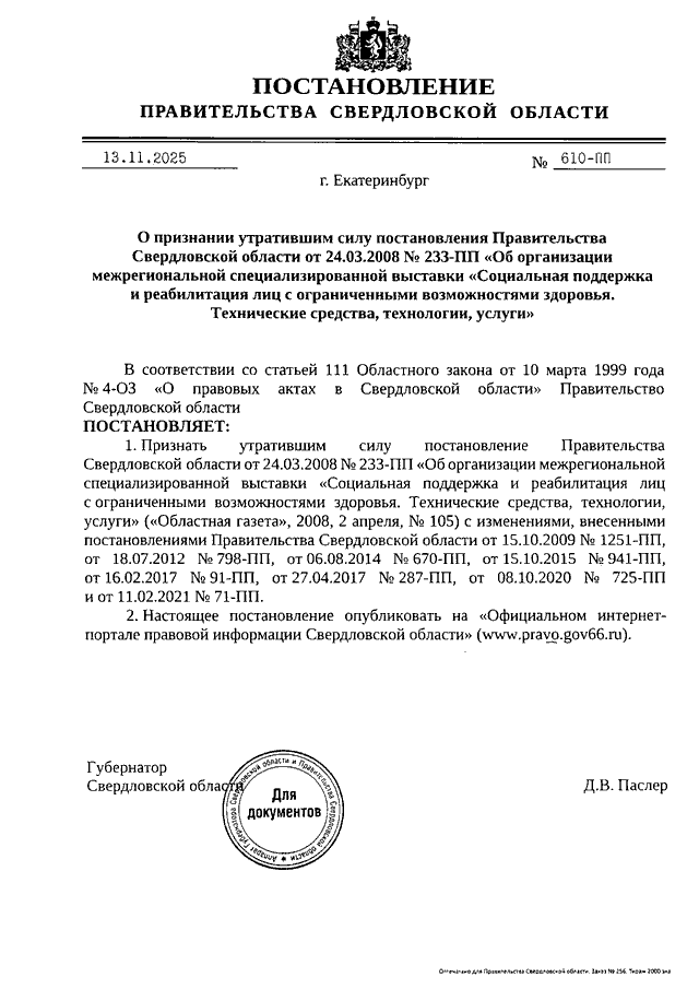 Постановление Правительства Свердловской области от 13.11.2025 N 610-ПП "О признании утратившим силу Постановления Правительства Свердловской области от 24.03.2008 N 233-ПП "Об организации межрегиональной специализированной выставки "Социальная поддержка и реабилитация лиц с ограниченными возможностями здоровья. Технические средства, технологии, услуги"