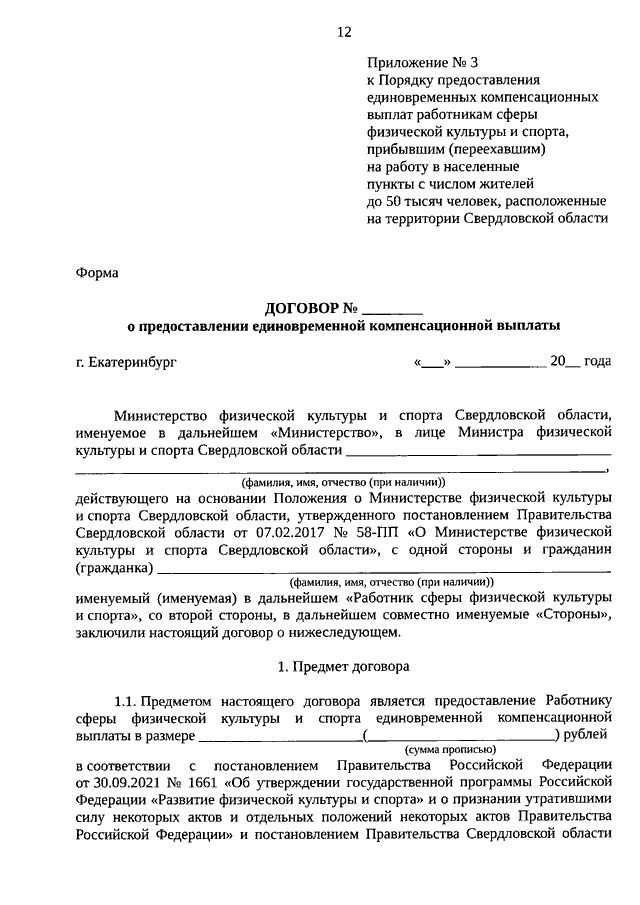 Постановление Правительства Свердловской области от 13.11.2025 N 618-ПП "Об утверждении Порядка предоставления единовременных компенсационных выплат работникам сферы физической культуры и спорта, прибывшим (переехавшим) на работу в населенные пункты с числом жителей до 50 тысяч человек, расположенные на территории Свердловской области, и перечня вакантных должностей работников сферы физической культуры и спорта Свердловской области, при замещении которых предоставляются единовременные компенсационные выплаты работникам сферы физической культуры и спорта, прибывшим (переехавшим) на работу в населенные пункты с числом жителей до 50 тысяч человек, расположенные на территории Свердловской области, на 2026 год"