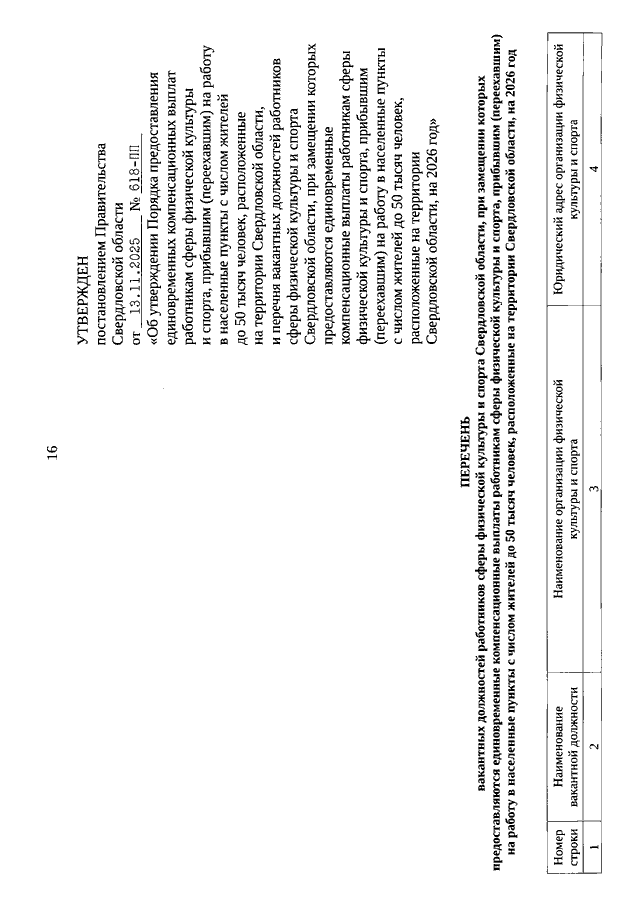 Постановление Правительства Свердловской области от 13.11.2025 N 618-ПП "Об утверждении Порядка предоставления единовременных компенсационных выплат работникам сферы физической культуры и спорта, прибывшим (переехавшим) на работу в населенные пункты с числом жителей до 50 тысяч человек, расположенные на территории Свердловской области, и перечня вакантных должностей работников сферы физической культуры и спорта Свердловской области, при замещении которых предоставляются единовременные компенсационные выплаты работникам сферы физической культуры и спорта, прибывшим (переехавшим) на работу в населенные пункты с числом жителей до 50 тысяч человек, расположенные на территории Свердловской области, на 2026 год"
