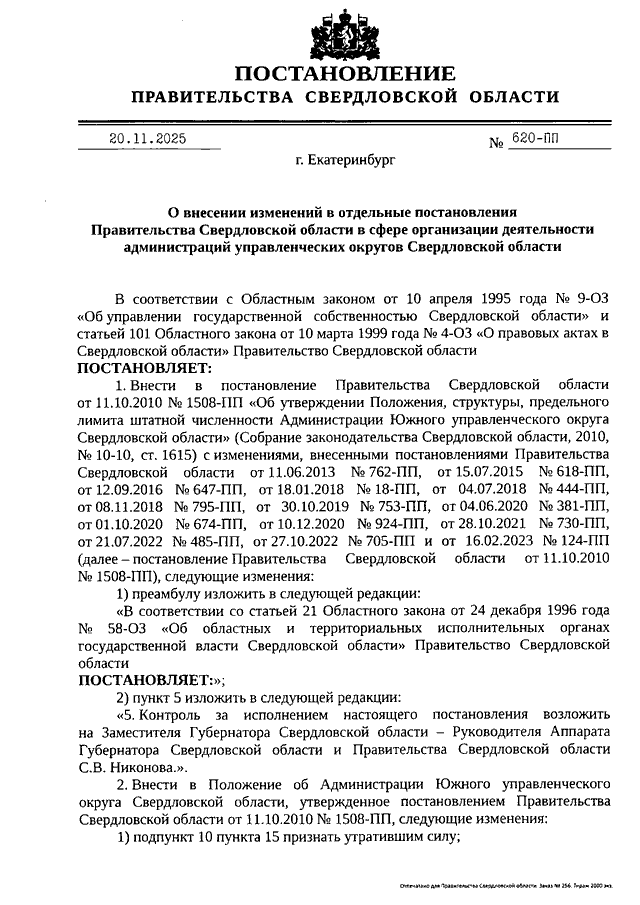 Постановление Правительства Свердловской области от 20.11.2025 N 620-ПП "О внесении изменений в отдельные постановления Правительства Свердловской области в сфере организации деятельности администраций управленческих округов Свердловской области"