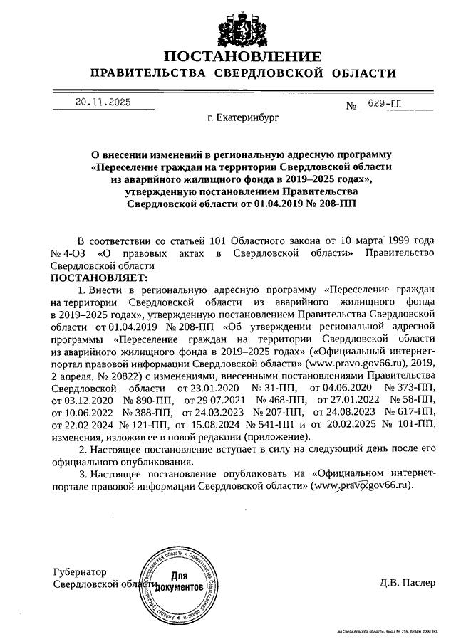 Постановление Правительства Свердловской области от 20.11.2025 N 629-ПП "О внесении изменений в региональную адресную программу "Переселение граждан на территории Свердловской области из аварийного жилищного фонда в 2019 - 2025 годах", утвержденную Постановлением Правительства Свердловской области от 01.04.2019 N 208-ПП"