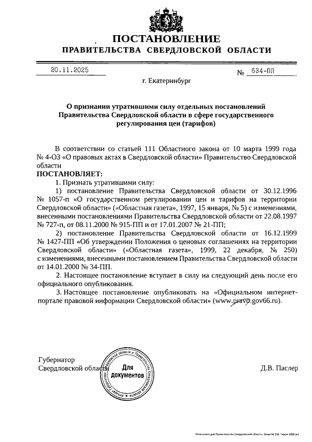 Постановление Правительства Свердловской области от 20.11.2025 N 634-ПП "О признании утратившими силу отдельных постановлений Правительства Свердловской области в сфере государственного регулирования цен (тарифов)"