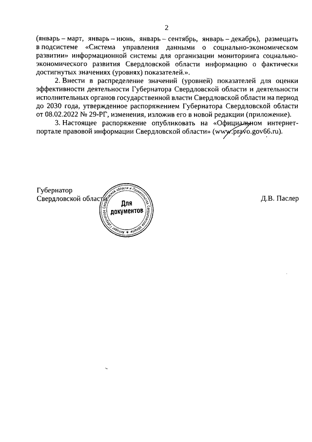 Распоряжение Губернатора Свердловской области от 19.11.2025 N 225-РГ "О внесении изменений в Распоряжение Губернатора Свердловской области от 08.02.2022 N 29-РГ "Об утверждении распределения значений (уровней) показателей для оценки эффективности деятельности Губернатора Свердловской области и деятельности исполнительных органов государственной власти Свердловской области на период до 2030 года и признании утратившим силу Распоряжения Губернатора Свердловской области от 15.12.2020 N 247-РГ "Об утверждении распределения значений (уровней) показателей для оценки эффективности деятельности Губернатора Свердловской области и деятельности исполнительных органов государственной власти Свердловской области на период до 2024 года, мониторинге и оценке уровня их достижения"