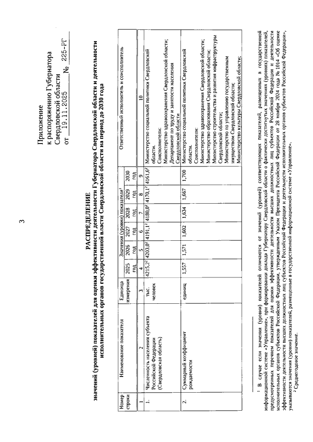 Распоряжение Губернатора Свердловской области от 19.11.2025 N 225-РГ "О внесении изменений в Распоряжение Губернатора Свердловской области от 08.02.2022 N 29-РГ "Об утверждении распределения значений (уровней) показателей для оценки эффективности деятельности Губернатора Свердловской области и деятельности исполнительных органов государственной власти Свердловской области на период до 2030 года и признании утратившим силу Распоряжения Губернатора Свердловской области от 15.12.2020 N 247-РГ "Об утверждении распределения значений (уровней) показателей для оценки эффективности деятельности Губернатора Свердловской области и деятельности исполнительных органов государственной власти Свердловской области на период до 2024 года, мониторинге и оценке уровня их достижения"