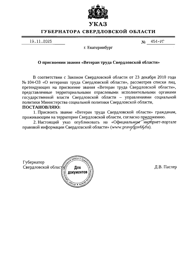 Указ Губернатора Свердловской области от 19.11.2025 N 454-УГ "О присвоении звания "Ветеран труда Свердловской области"