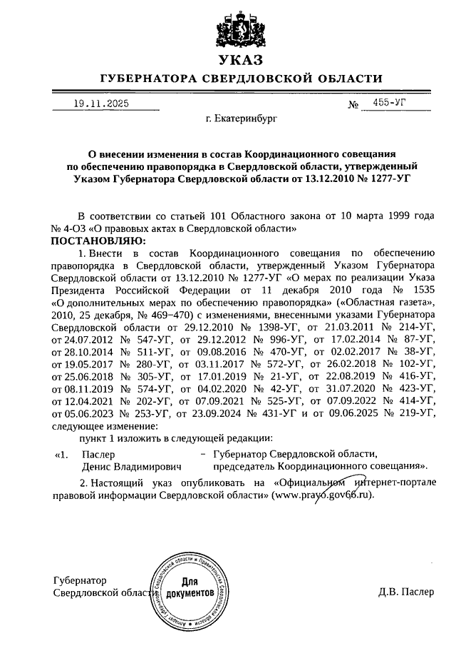 Указ Губернатора Свердловской области от 19.11.2025 N 455-УГ "О внесении изменения в состав Координационного совещания по обеспечению правопорядка в Свердловской области, утвержденный Указом Губернатора Свердловской области от 13.12.2010 N 1277-УГ"