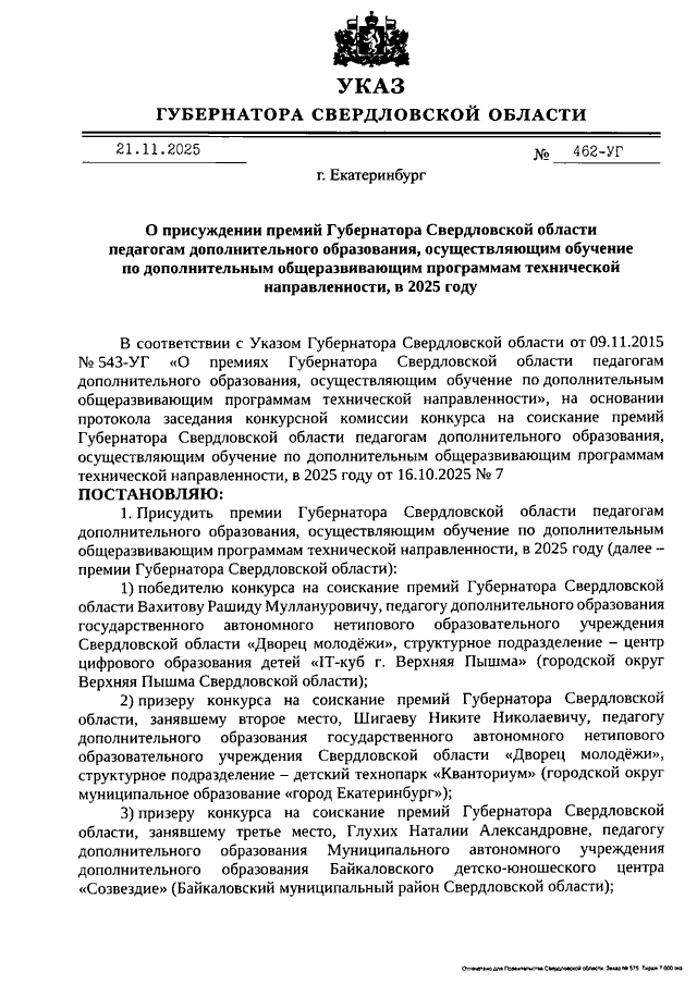 Указ Губернатора Свердловской области от 21.11.2025 N 462-УГ "О присуждении премий Губернатора Свердловской области педагогам дополнительного образования, осуществляющим обучение по дополнительным общеразвивающим программам технической направленности, в 2025 году"