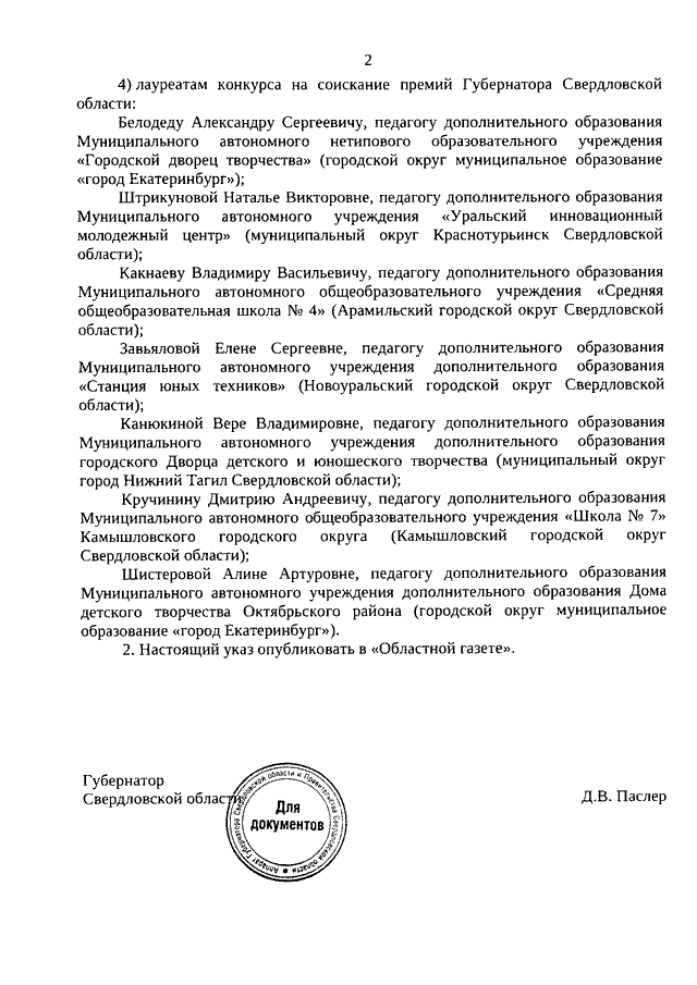 Указ Губернатора Свердловской области от 21.11.2025 N 462-УГ "О присуждении премий Губернатора Свердловской области педагогам дополнительного образования, осуществляющим обучение по дополнительным общеразвивающим программам технической направленности, в 2025 году"