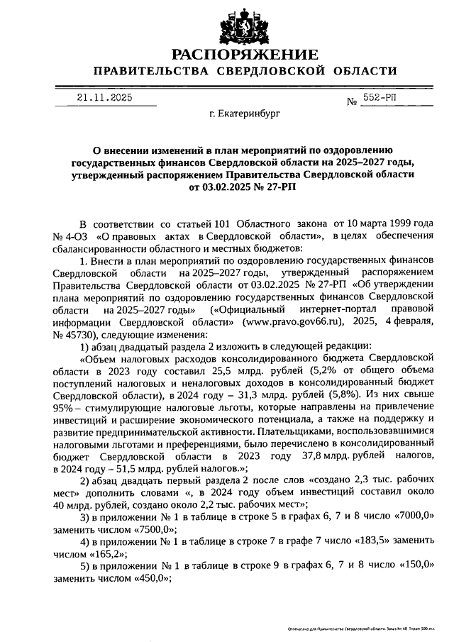 Распоряжение Правительства Свердловской области от 21.11.2025 N 552-РП "О внесении изменений в план мероприятий по оздоровлению государственных финансов Свердловской области на 2025 - 2027 годы, утвержденный Распоряжением Правительства Свердловской области от 03.02.2025 N 27-РП"