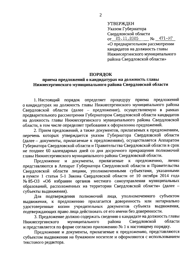 Указ Губернатора Свердловской области от 25.11.2025 N 471-УГ О предварительном рассмотрении кандидатов на должность главы Нижнесергинского муниципального района Свердловской области
