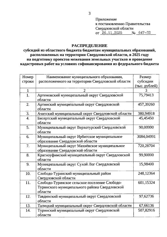 Постановление Правительства Свердловской области от 26.11.2025 N 647-ПП "О внесении изменений в Постановление Правительства Свердловской области от 06.02.2025 N 62-ПП "О распределении субсидий из областного бюджета бюджетам муниципальных образований, расположенных на территории Свердловской области, в 2025 году в рамках реализации государственной программы Свердловской области "Реализация основных направлений государственной политики в сферах агропромышленного комплекса и потребительского рынка Свердловской области"